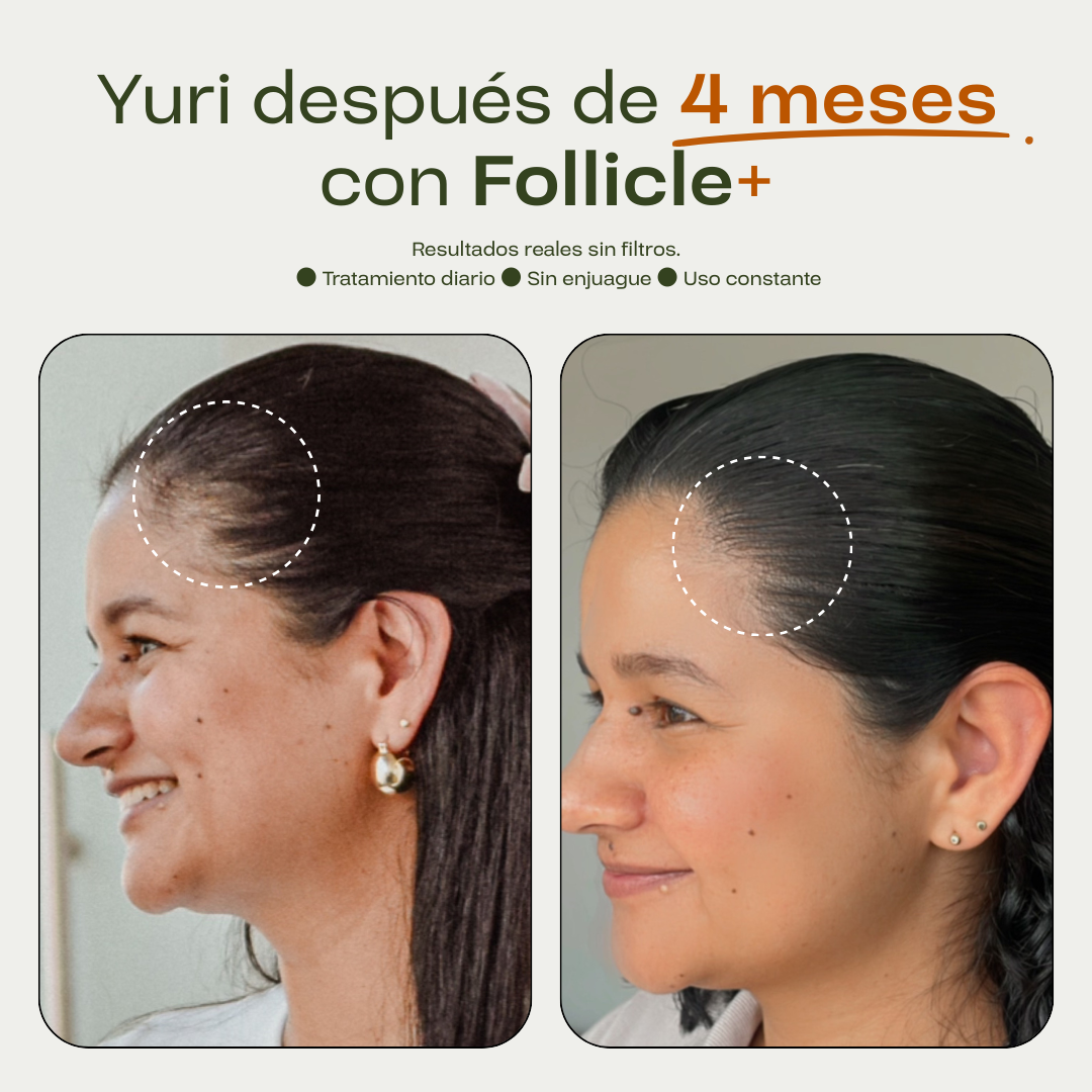 La reducción de la caída suele sentirse a partir de la semana 4. Los primeros “baby hairs” aparecen entre la semana 4 y 8, y la densidad mejora progresivamente durante los primeros 3 meses. Además, estudios realizados con el Tripéptido de Cobre — el ingrediente activo principal de Follicle+ — indican resultados clínicos sólidos a partir de la semana 16 de uso continuo. Por eso, el tratamiento recomendado es de 4 meses, equivalente a 4 tónicos, para obtener resultados completos y duraderos.