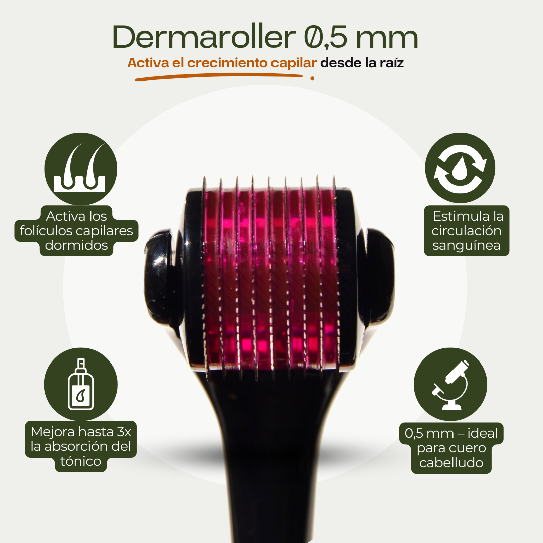 El Dermaroller de 0,5 mm es totalmente seguro y diseñado para uso en casa. No duele, no sangra y no deja marcas visibles. Su función es crear microcanales superficiales que aumentan hasta un 80% la absorción del tónico y activan la circulación del folículo. Usarlo 2–3 veces por semana es suficiente.