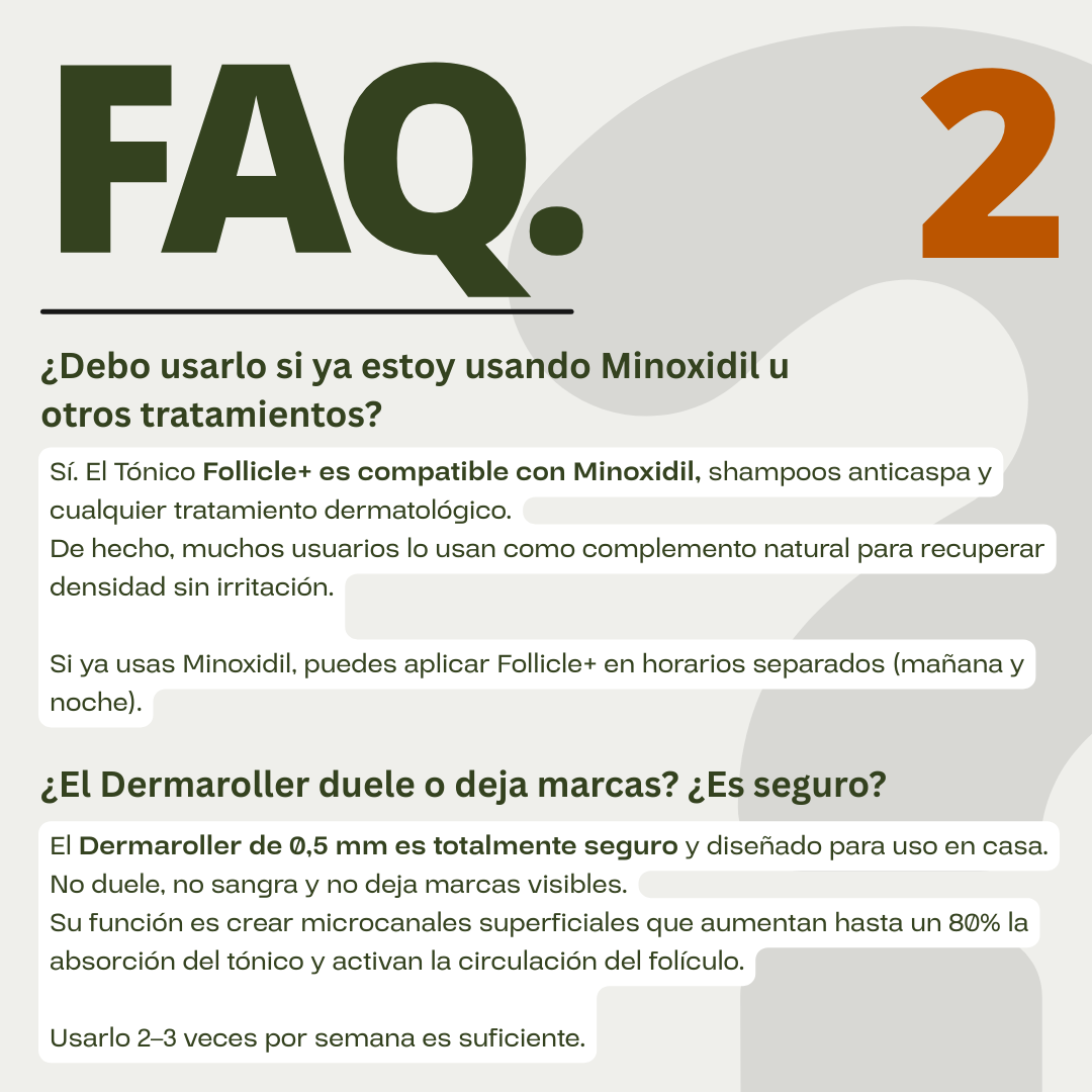 Sí. Follicle+ es compatible con Minoxidil, shampoos anticaspa y cualquier tratamiento dermatológico. De hecho, muchos usuarios lo usan como complemento natural para recuperar densidad sin irritación. Si ya usas Minoxidil, puedes aplicar Follicle+ en horarios separados (mañana y noche).